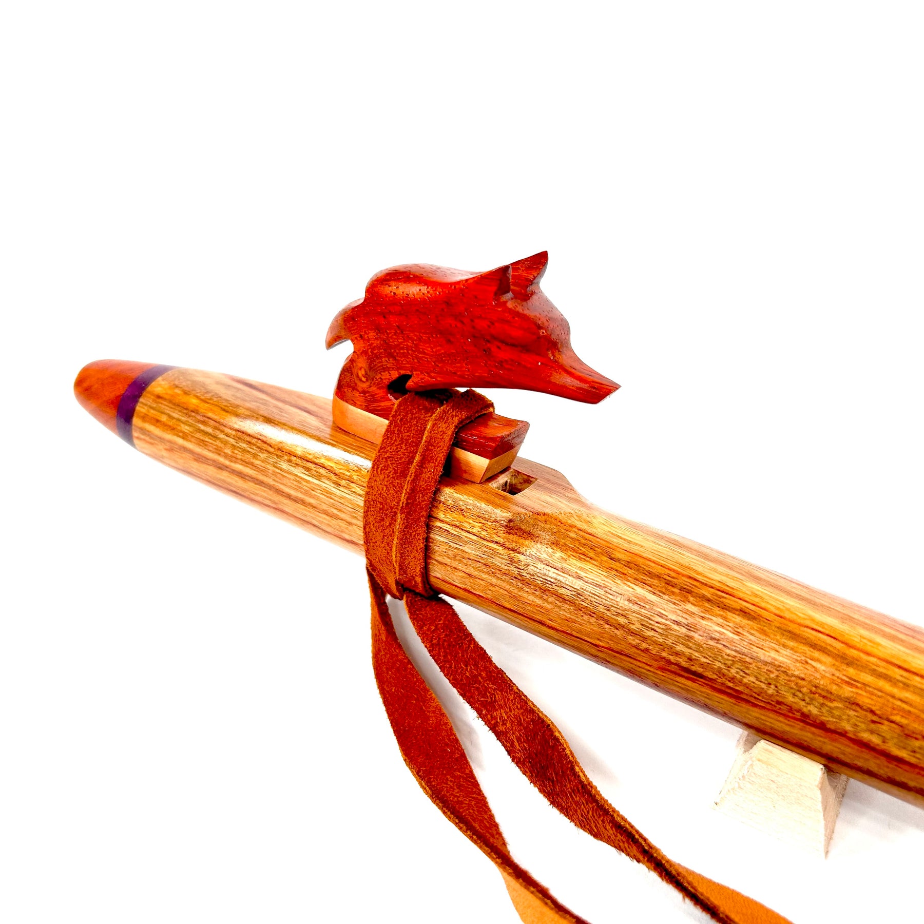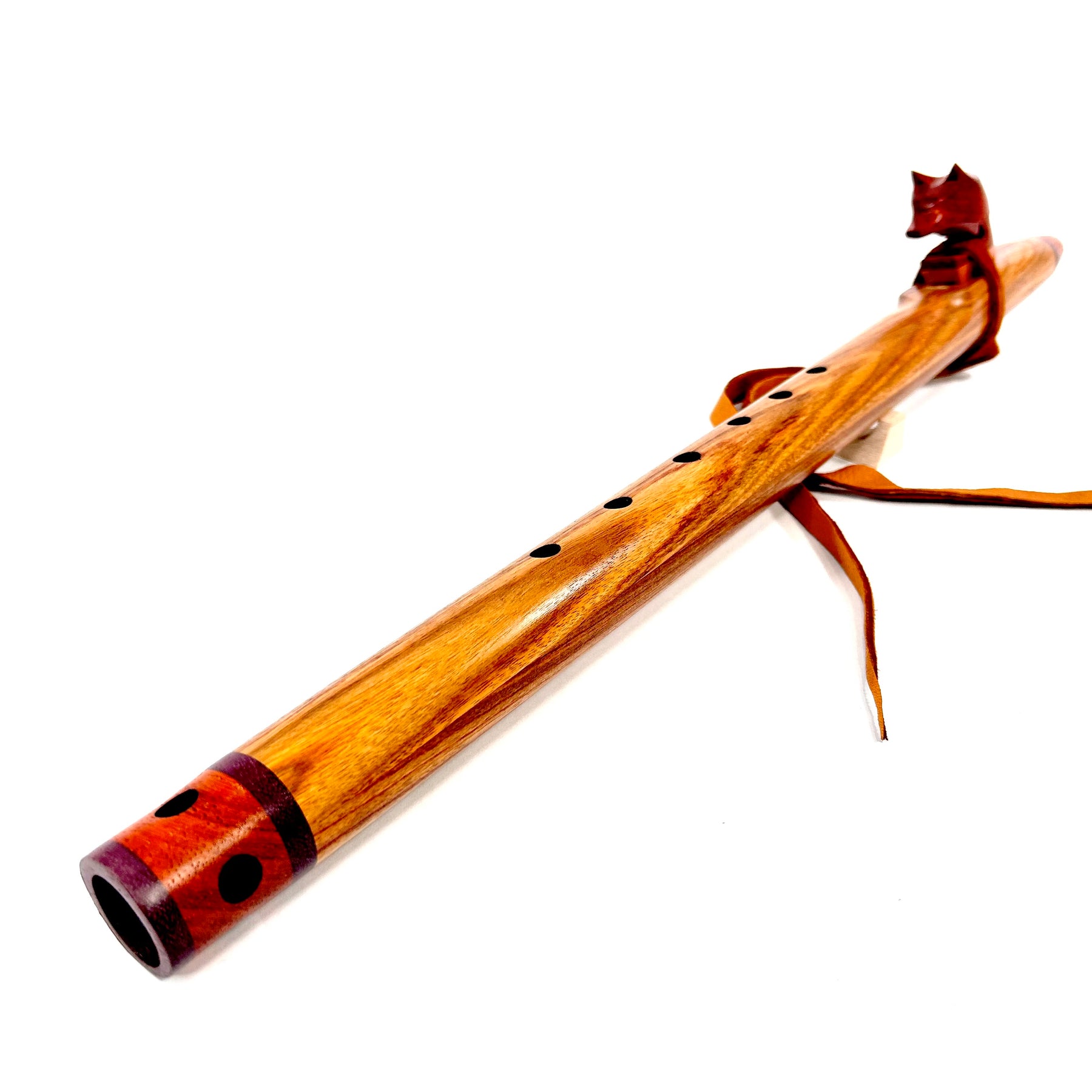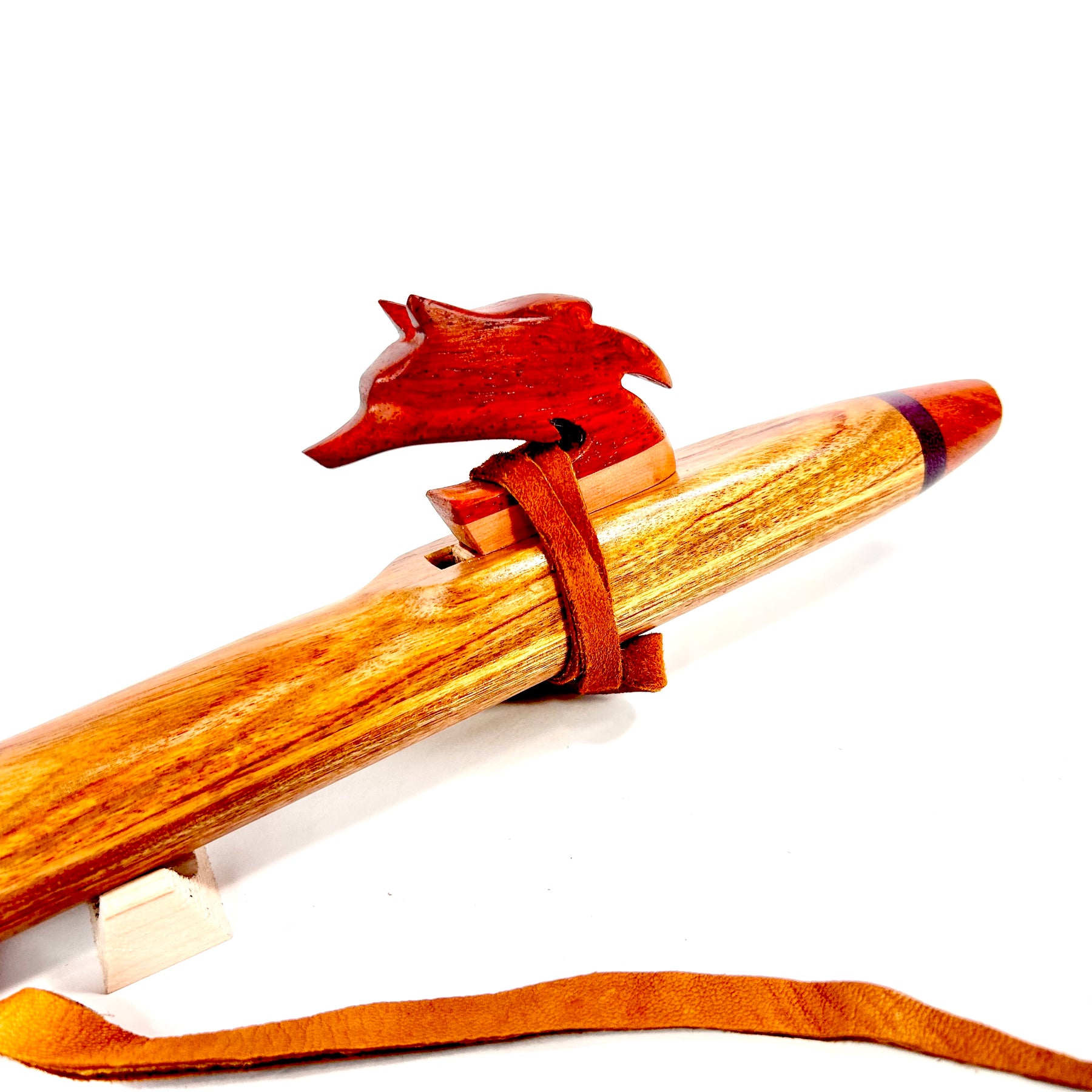 This flute is gorgeous and is made of canarywood. It has paduk caps, and beautiful fox fetish, as well as purple heart accents! This is a candy like, colorful piece and the sound is very responsivE