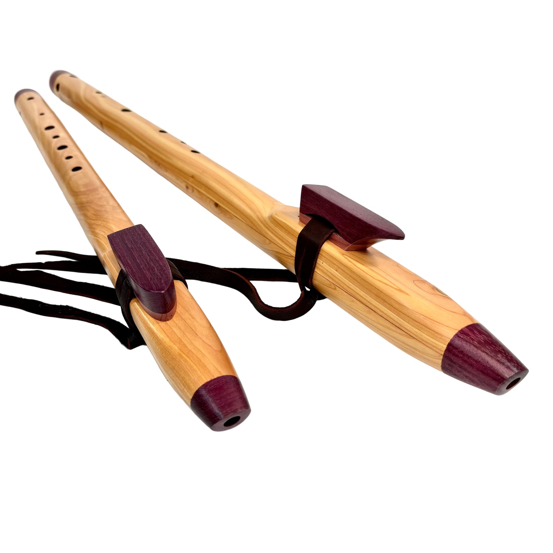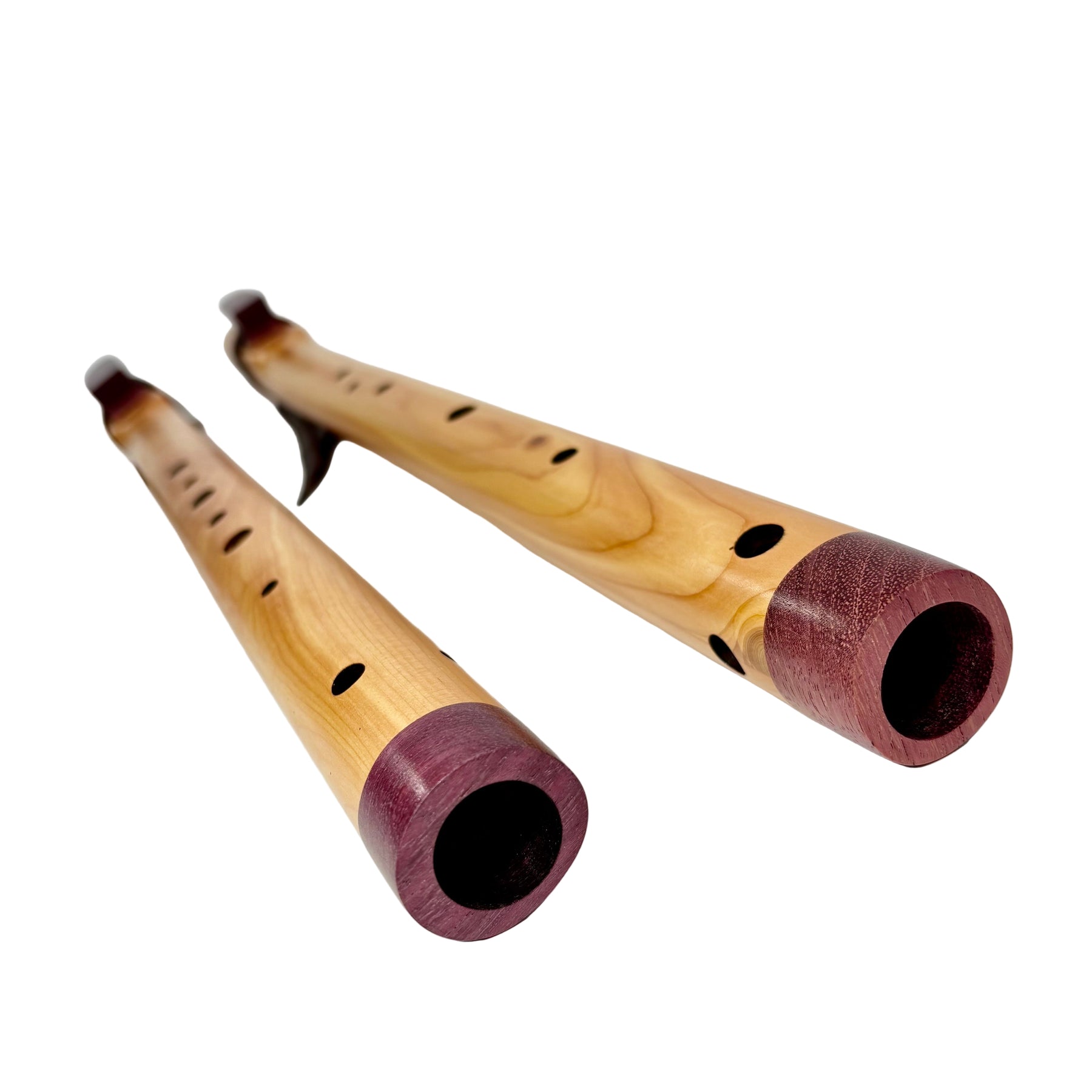Here is a special pair of Native American style flutes made of Juniper, a sustainable wood harvested in to help re establish the natural ecosystem in eastern Oregon. The end caps and sound block are of Purple Heart, and the are tuned to the Hijaz scale. This is one of the more popular Arabic tunings. Both of these are keys that are rare for us to make in this scale, so I’m sure they’ll sell quickly. See video for the gorgeous tones and special thumb hole feature on the low D D$825 F# $595 (Apologies, The Eb flute was labeled as a low D in the video)