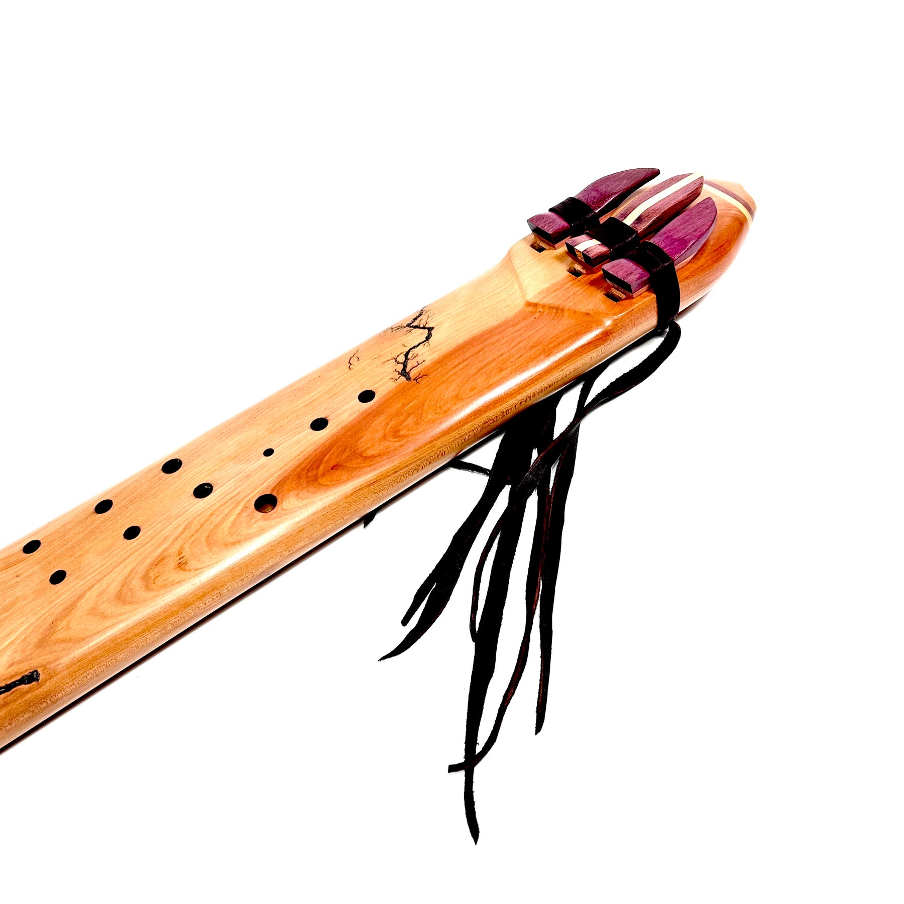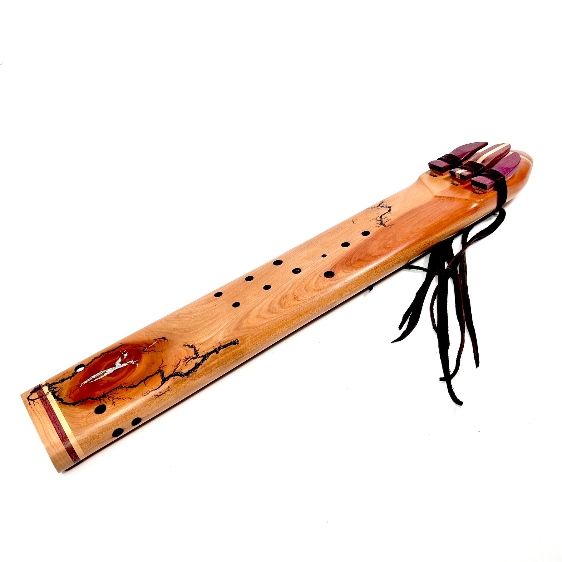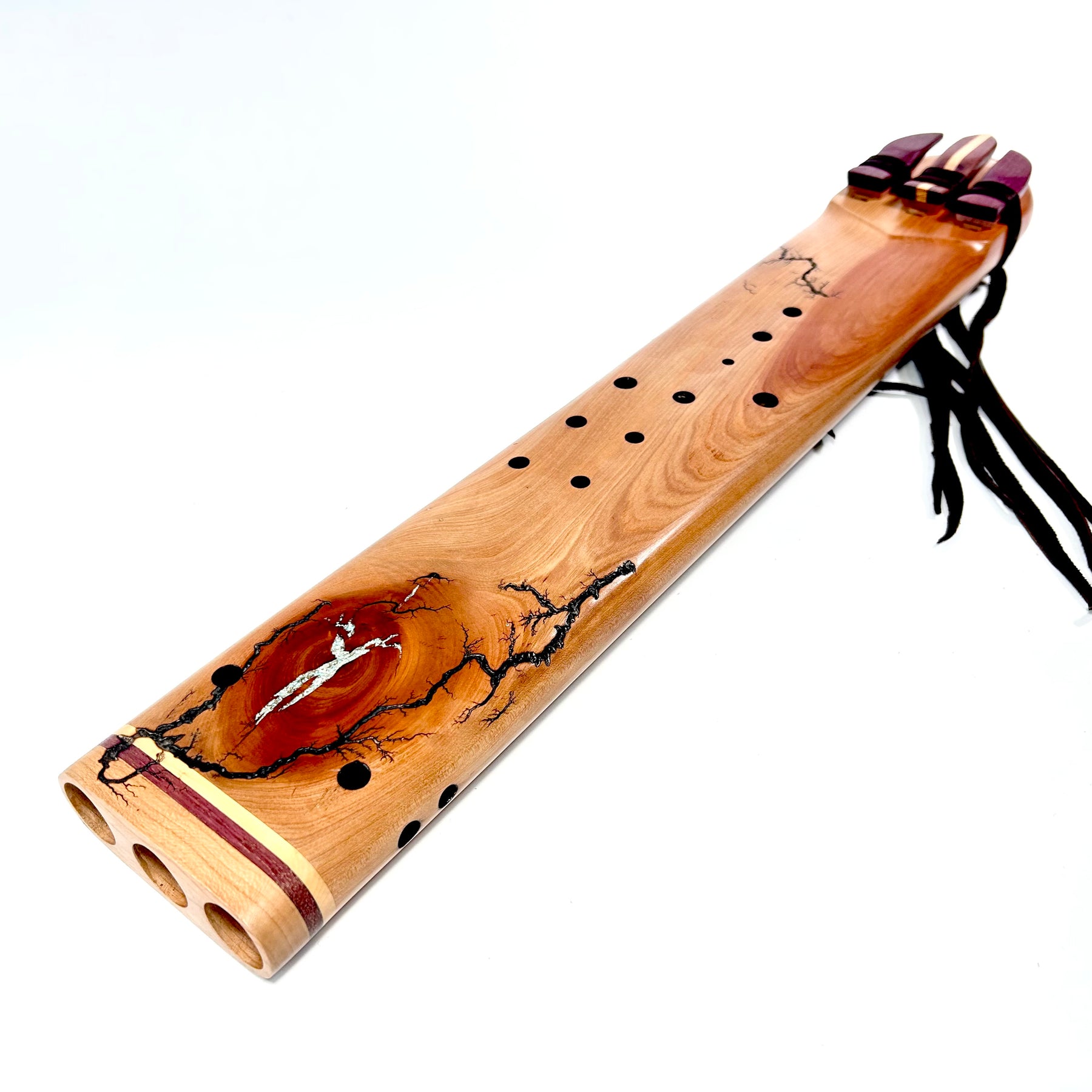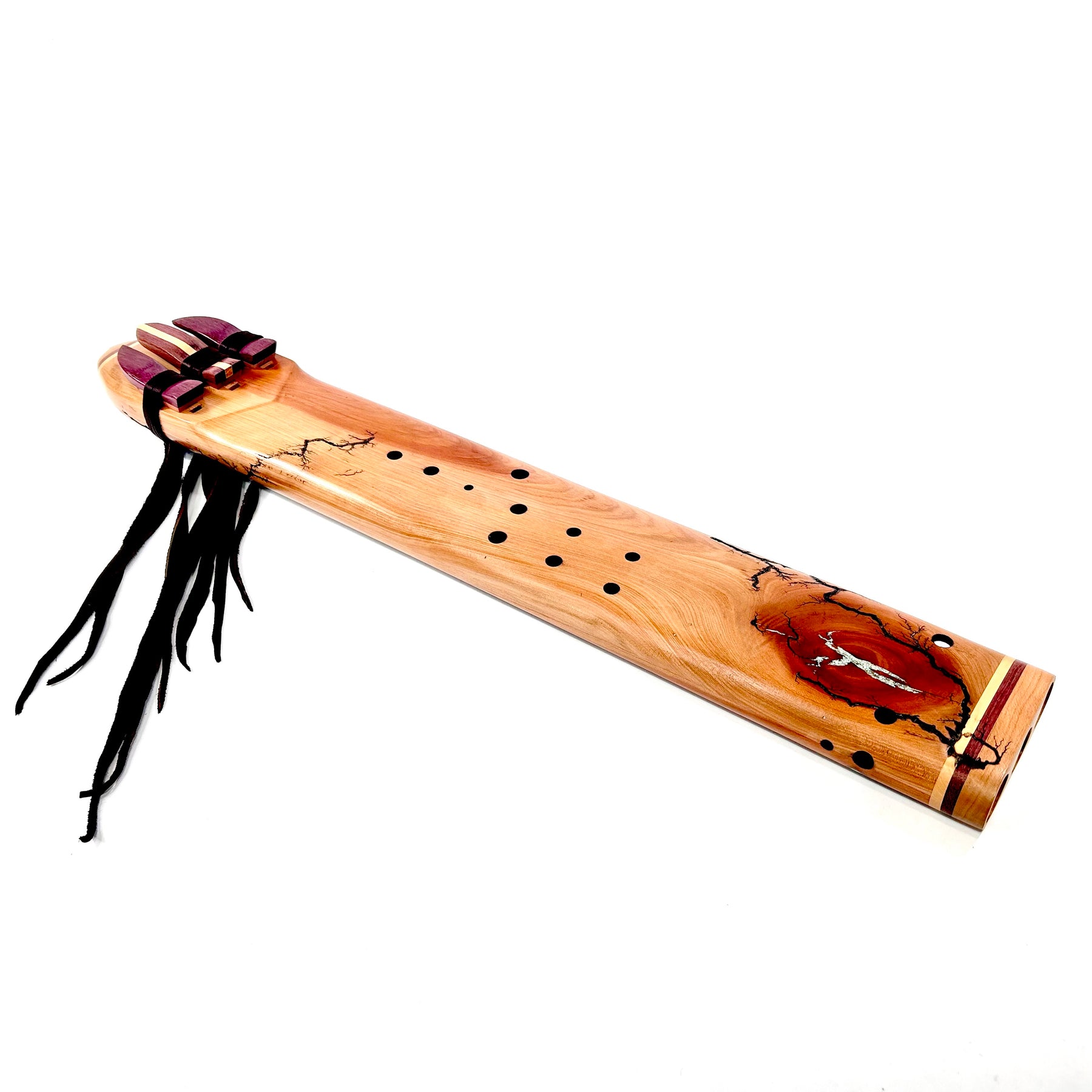 This is first of its kind, and can't be replicated! This incredible triple drone made of madrone wood with maple bands and purple heart accents accents. It is adorned with lichtenberg art, and turquoise inlay in a knot hole that looks like a dancing spirit. This flute  is basically three flutes in one! Designed for more intermediate/advanced players, this flute has endless possibilities for harmonizing new sacred sounds!  It's low tone will relax even the most restless soul!