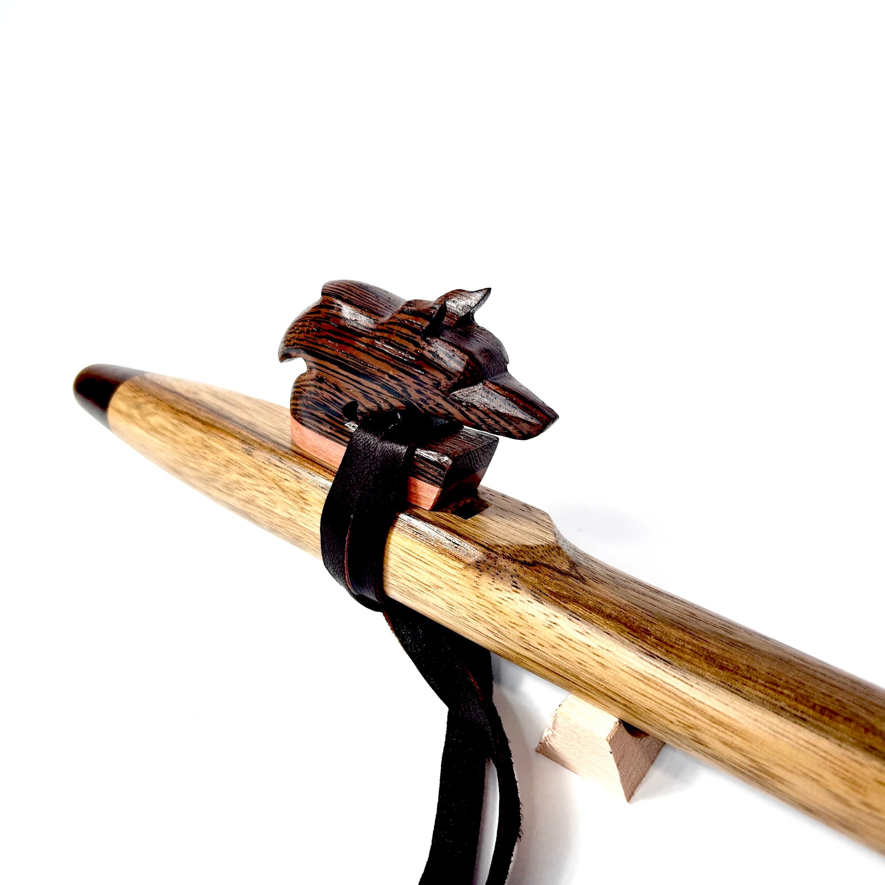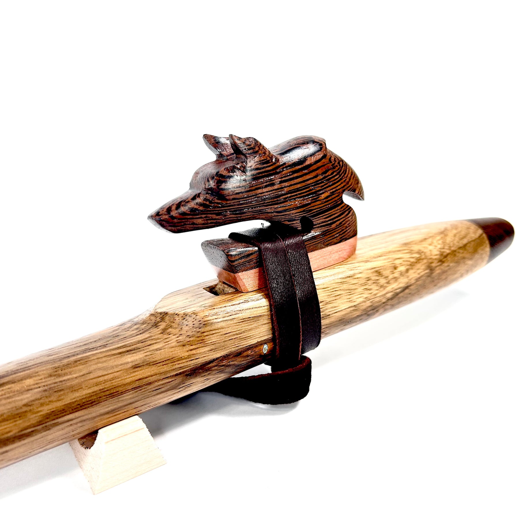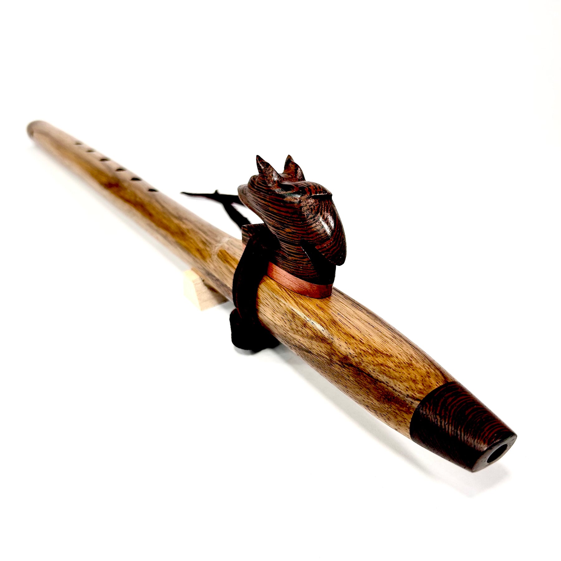 Here is a beautiful hardwood flute hosting a beautiful wolf themed design and a vibrant and responsive mid ranged tone. Made of limba with wenge end caps and wolf totem, this is made of high quality  hardwoods. These mid ranged keys give the classic NAF sound, with a low and meditative feel take a listen and see if this one is for you!