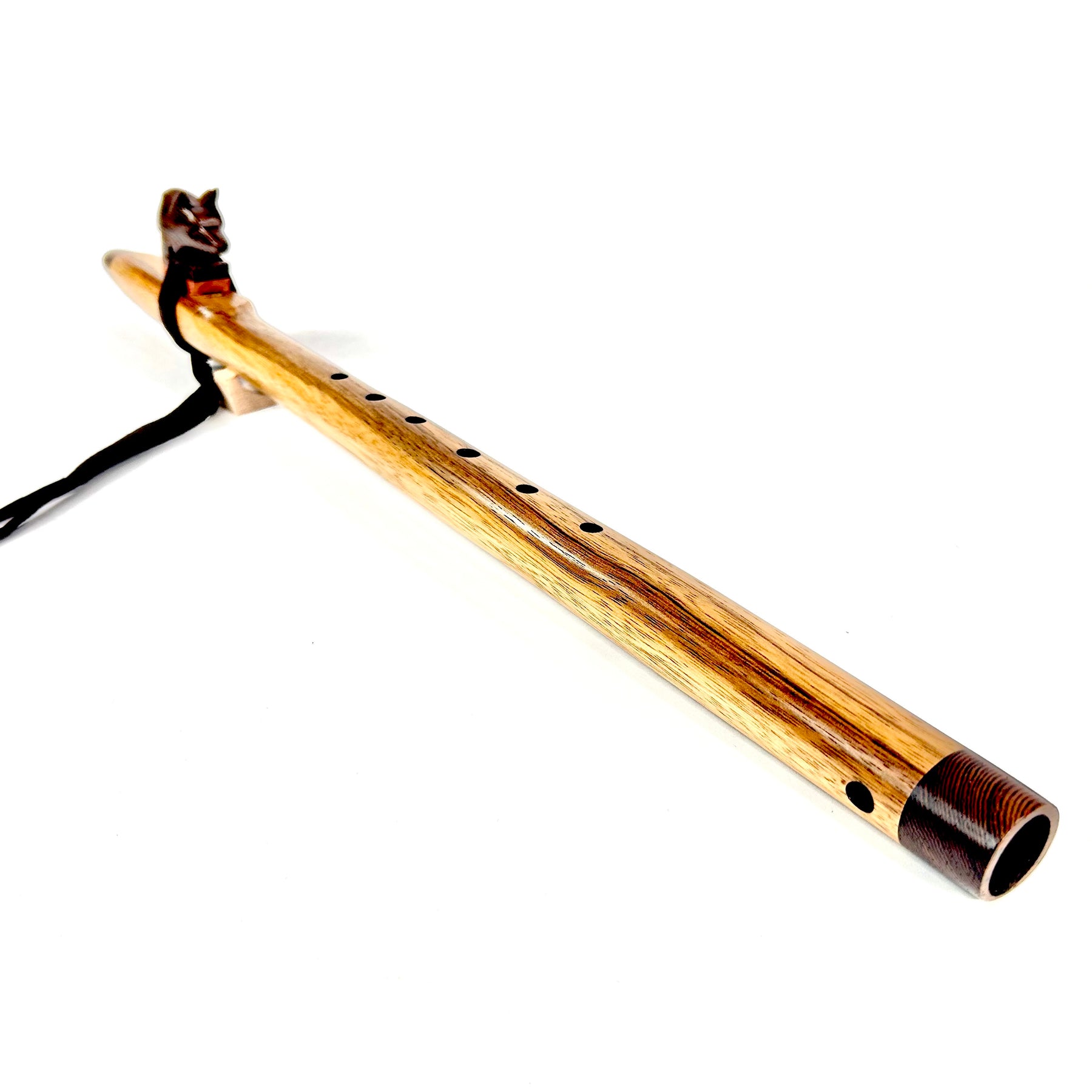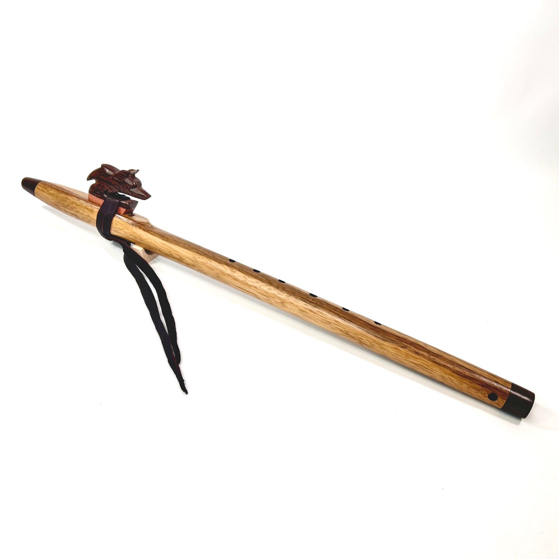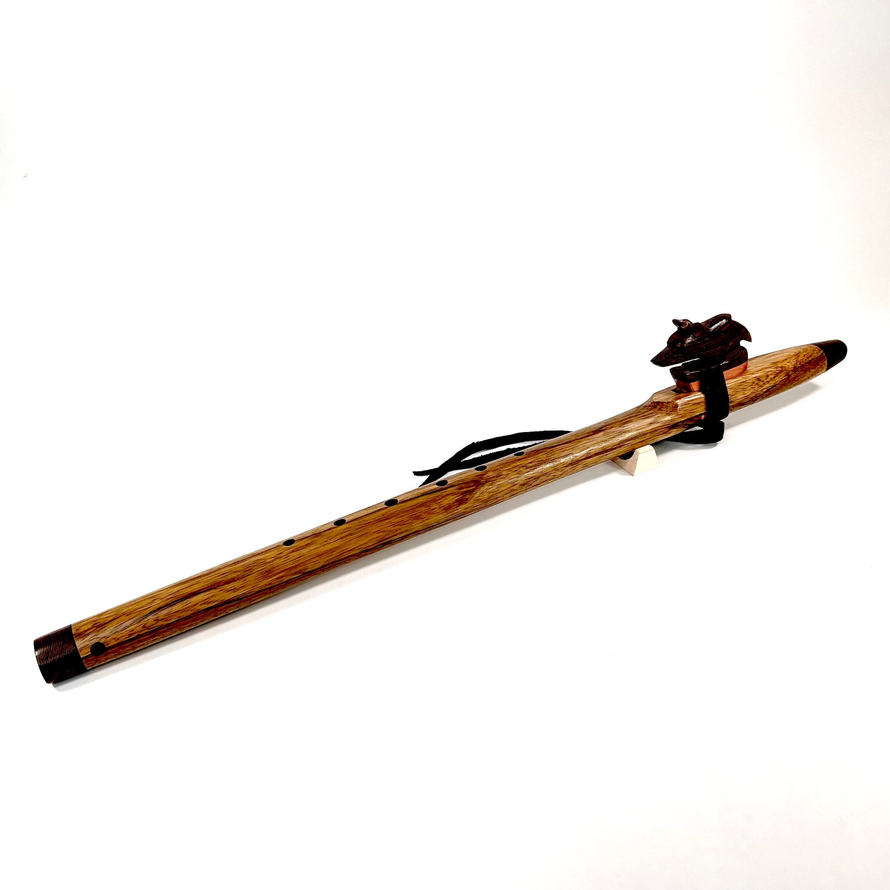 Here is a beautiful hardwood flute hosting a beautiful wolf themed design and a vibrant and responsive mid ranged tone. Made of limba with wenge end caps and wolf totem, this is made of high quality  hardwoods. These mid ranged keys give the classic NAF sound, with a low and meditative feel take a listen and see if this one is for you!