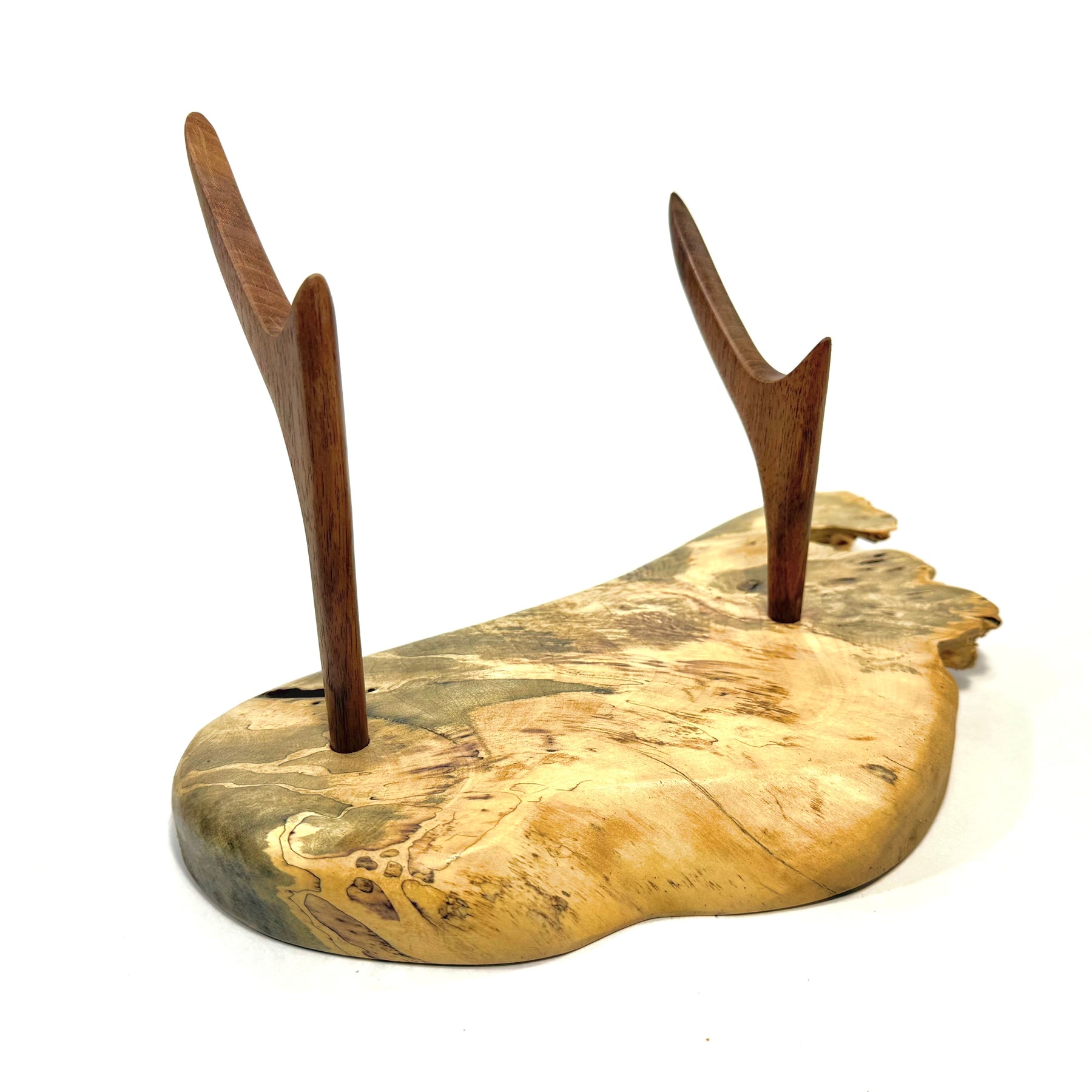 Here’s a stunner with new design and new tuning. Since this listing we've now modified the flute to have the added cork feature so there's now even more diversity,AND It now comes with a beautiful display stand!! This is a very special Flute!! See the Video above !Triple Drone flute in g sharp minor with E flat drone side. The 4th below drone flute gives a very haunting element to the flute! The Artwork alone took MANY HOURS of meticulous craftsmanship. It's made of Alaskan Cedar with Buckeye burl end caps and sound blocks. The woodburn art is Taino Indigenous inspired art.