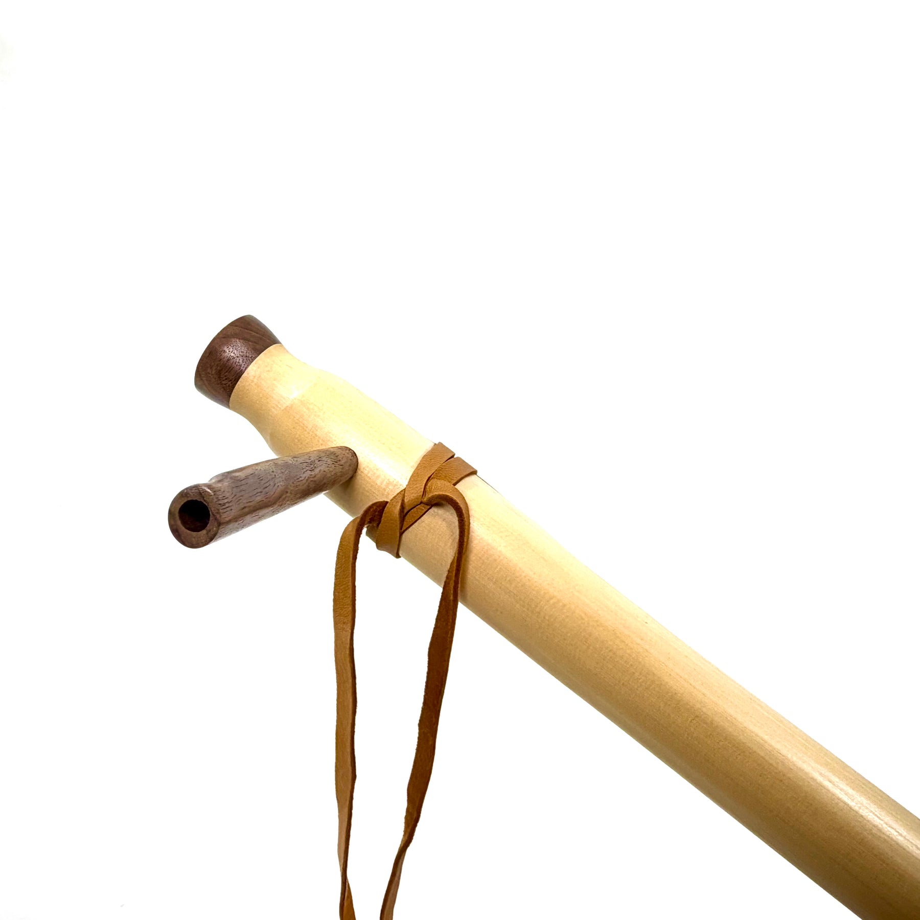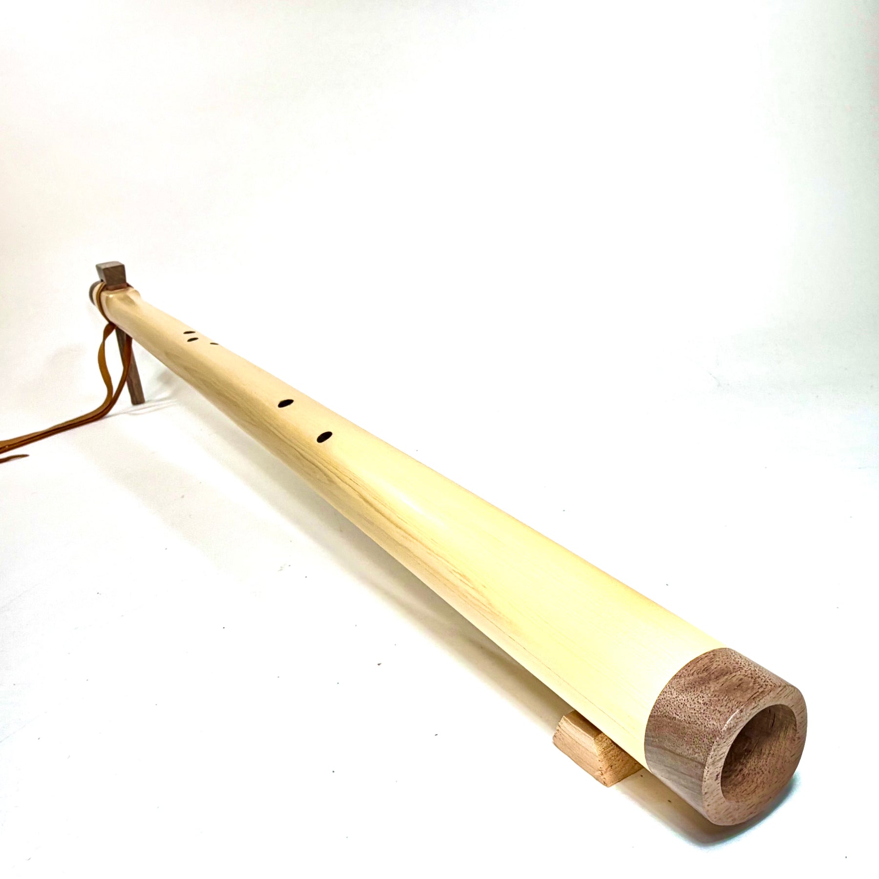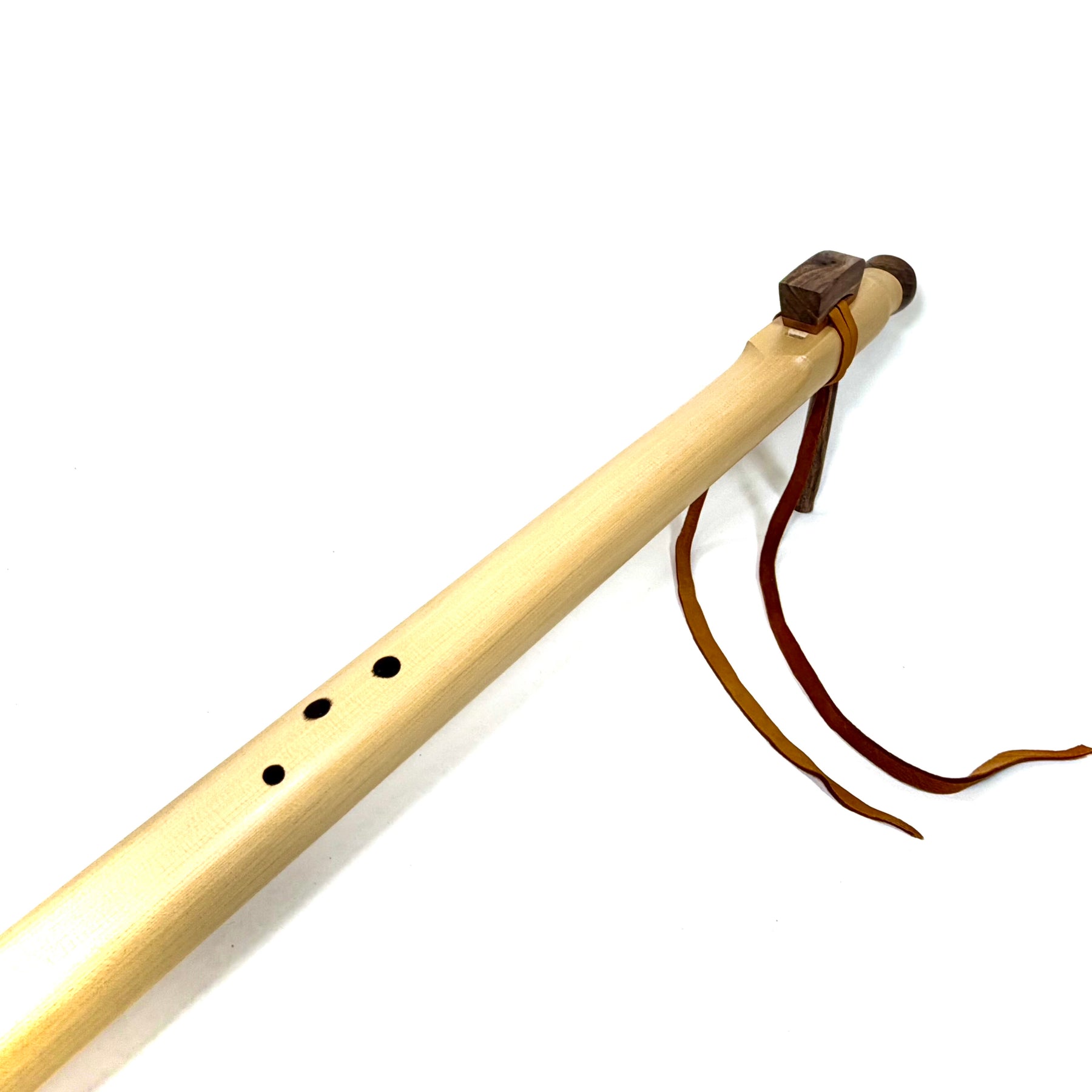 Here is a beautiful Native American style bass flute hand crafted from alaskan cedar and walnut with a back blown mouth piece for a more comfortable reach. This is a larger sized flute, but for a contrabass flute it actually has a relatively close finger spread, so smaller handed, more experienced players, should be able to manage this. This flute is a great choice for people who want a low tone but are concerned about reaching larger holes and a farther finger spread. This flute has a clear, vibrant bass tone.
